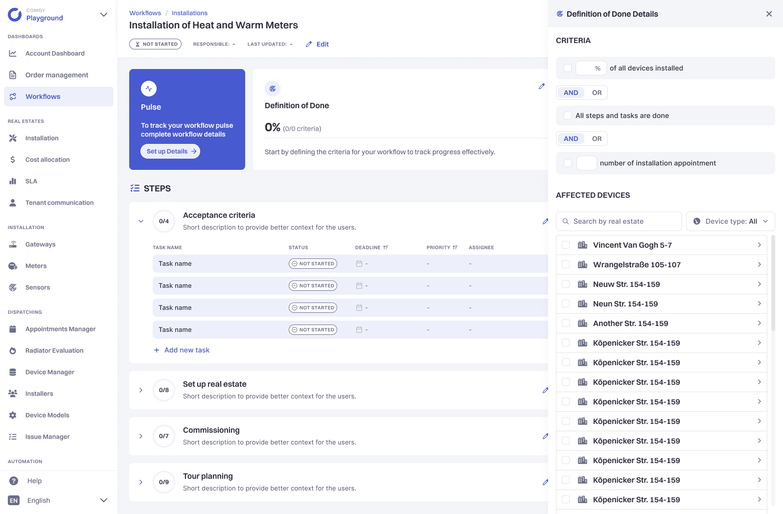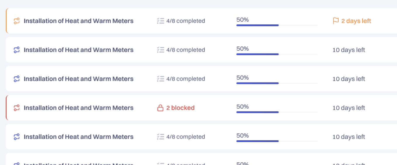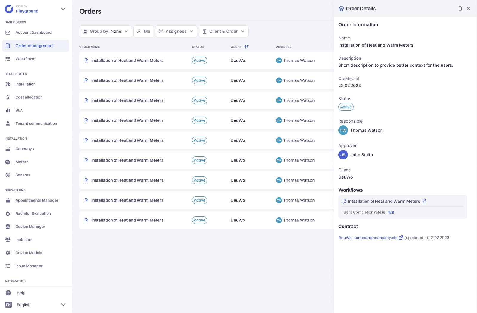 As part of this system there is a core module that handles metering devices procurement and distribution. Real Estate Management companies uses the module in order to manage, monitor and report installation process together with Device Installation business they subcontract.