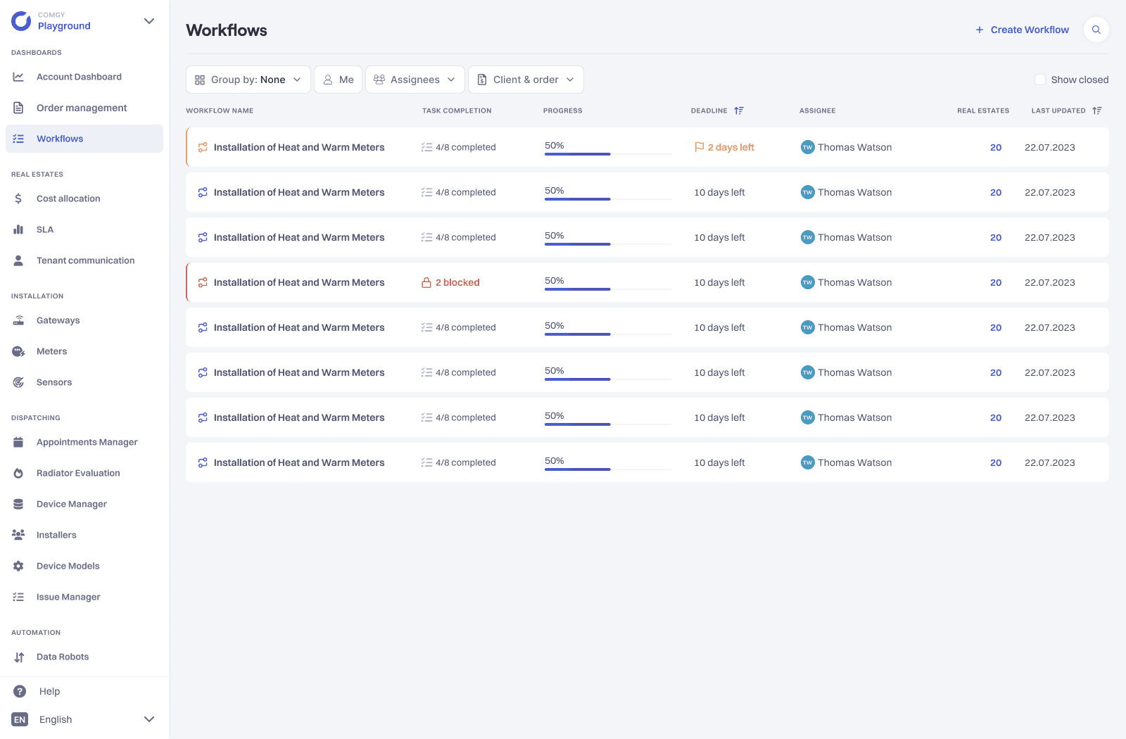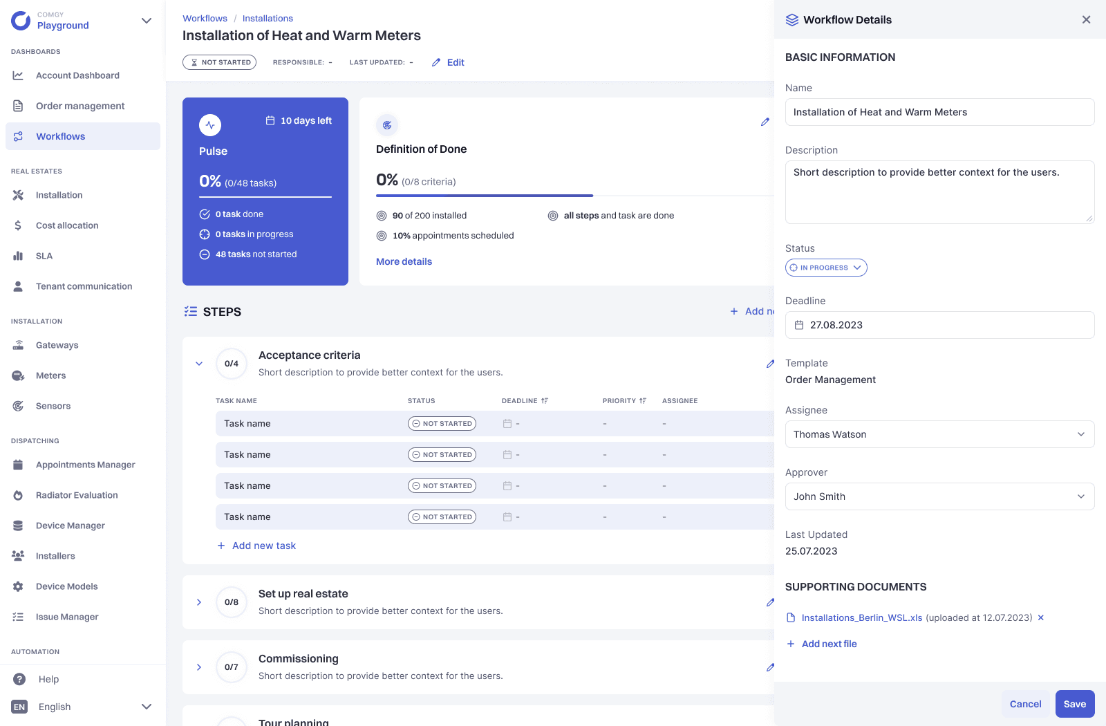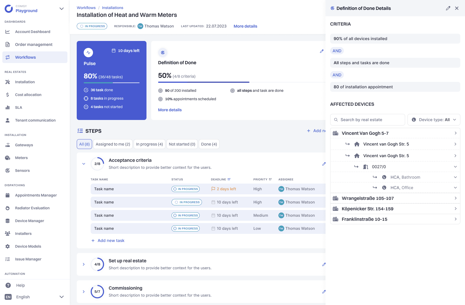 As part of this system there is a core module that handles metering devices procurement and distribution. Real Estate Management companies uses the module in order to manage, monitor and report installation process together with Device Installation business they subcontract.